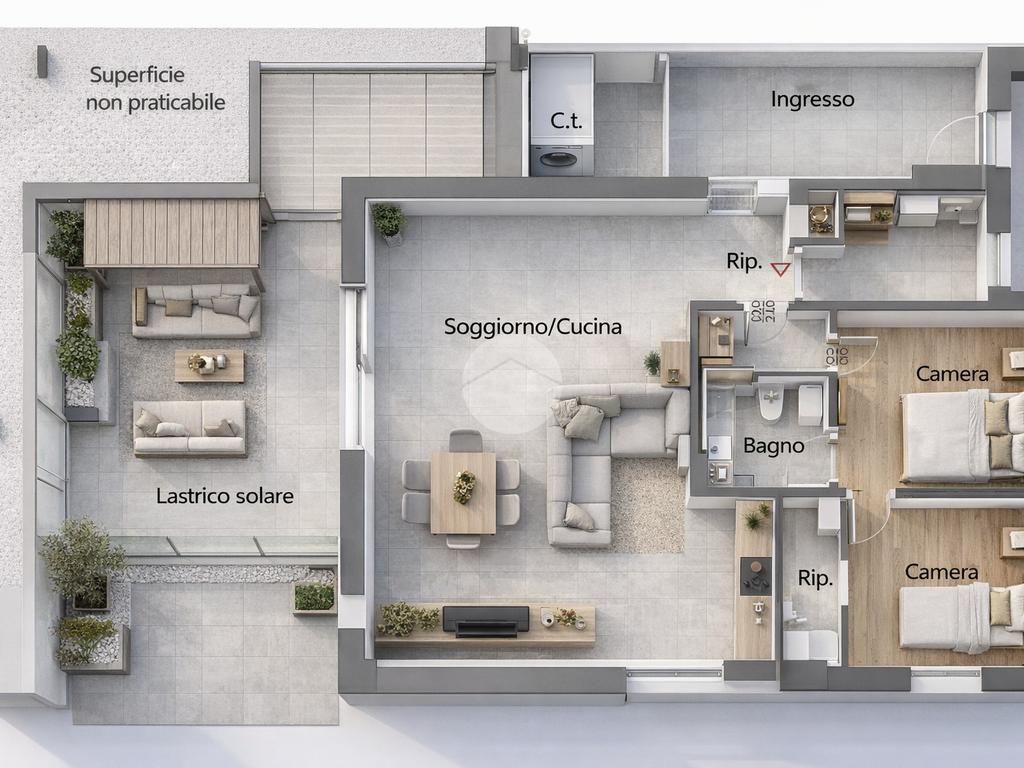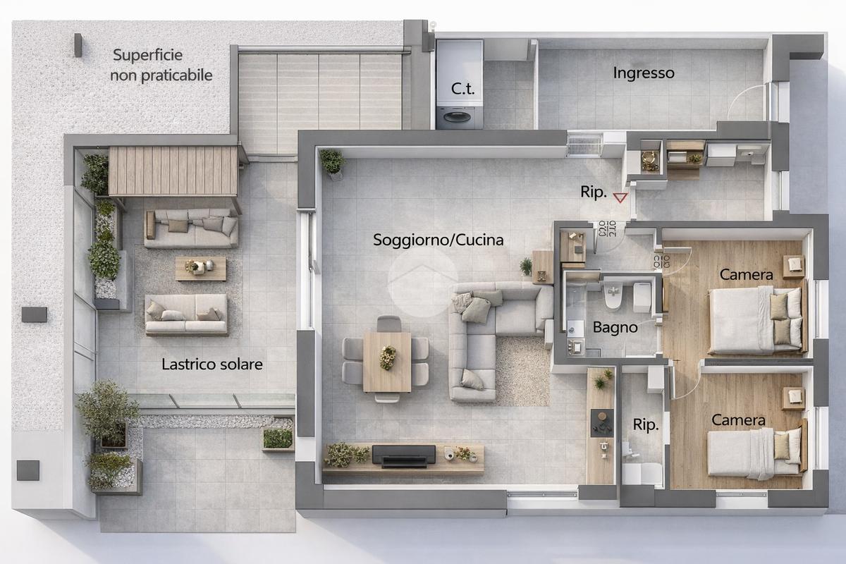 L’ingresso si apre su uno spazio dedicato e riservato, ideale come zona filtro, guardaroba o area di accoglienza, che accompagna armoniosamente verso la luminosa zona giorno con soggiorno e cucina a vista. Un ambiente accogliente e ben organizzato che si affaccia direttamente su una splendida terrazza, perfetta per pranzi all’aperto, momenti di relax o per creare una vera e propria zona living esterna.